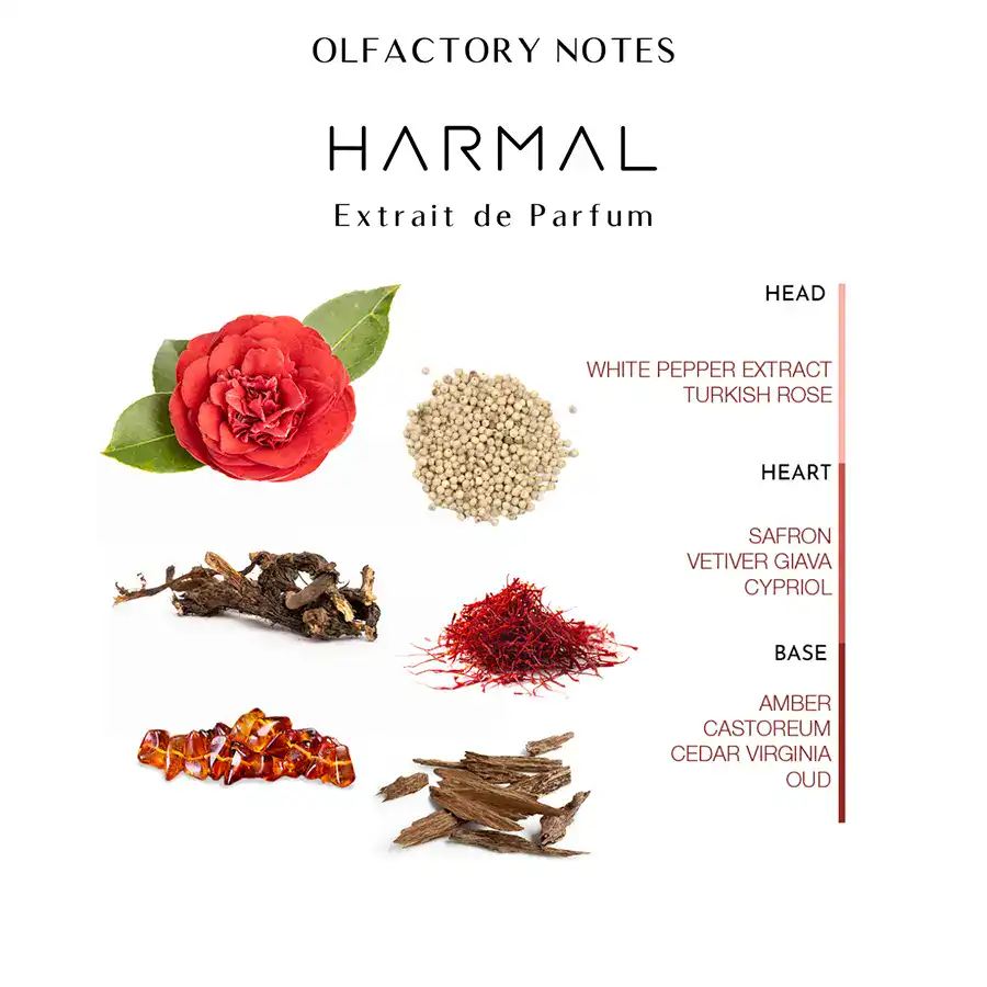 At its very core lies an infusion of amber’s warm glow and castoreum’s primal charm. Cedar Virginia whispers ancient tales as oud’s smoky tendrils envelop the senses in an intoxicating embrace. HARMAL (Flower) is not a fragrance; it is pure poetry bottled—a fragrant ode to grace, sensuality, and timeless elegance—leaving behind a trail that lingers long after you have departed from any room you grace with your presence.